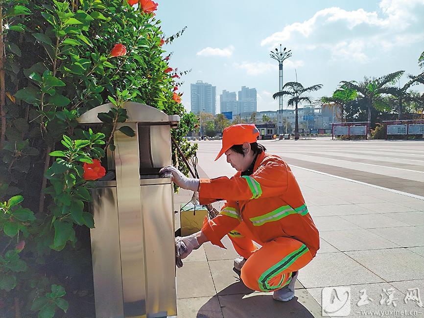 何玉鳳在認(rèn)真擦拭垃圾桶。