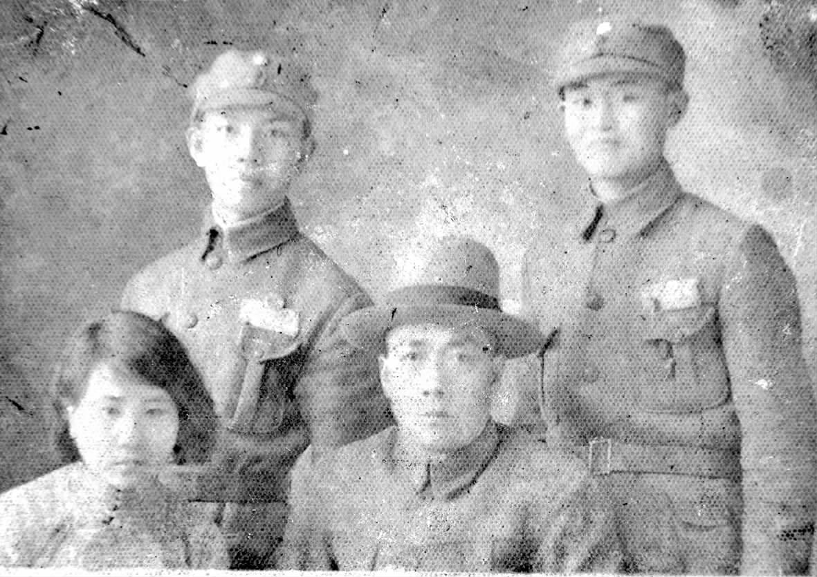 尉遲毓鳴(前排右一)與夫人楊德琴及勤務(wù)兵合影。