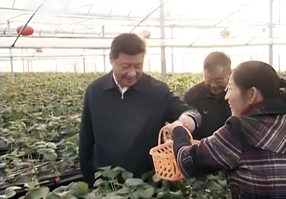 △2014年12月13日,習(xí)近平總書記在江蘇鎮(zhèn)江市世業(yè)鎮(zhèn)先鋒村農(nóng)業(yè)園草莓大棚,實(shí)地察看草莓生長情況。