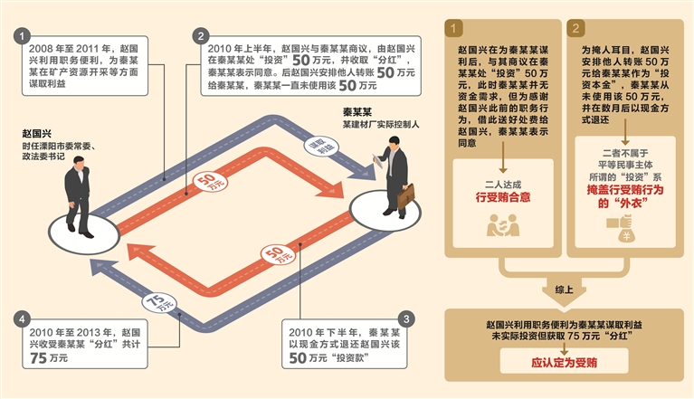 2008年至2011年,趙國興利用擔(dān)任溧陽市委常委、政法委書記的職務(wù)便利,為某建材廠實(shí)際控制人秦某某在礦產(chǎn)資源開采、安全事故處理等方面謀取利益。2010年上半年,趙國興與秦某某商議,由趙國興在秦某某處“投資”50萬元,并收取“分紅”,秦某某表示同意。后趙國興安排他人轉(zhuǎn)賬50萬元給秦某某,秦某某一直未使用該50萬元。2010年下半年,秦某某以現(xiàn)金方式退還趙國興該50萬元“投資款”,2010年至2013年,趙國興收受秦某某以“分紅”名義所送財(cái)物共計(jì)75萬元。