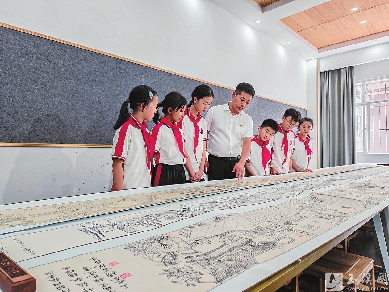 美術(shù)課上,老師帶領(lǐng)同學(xué)們欣賞聶耳故居長卷。