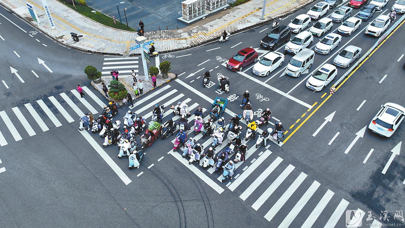 中心城區(qū)多個路口設(shè)置了二輪車待行區(qū),有效解決混行、低效、高風(fēng)險的“老難題”。圖為中心城區(qū)珊瑚路與玉帶路交叉口。
