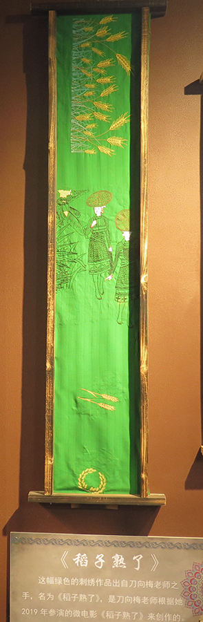 面對(duì)現(xiàn)代市場(chǎng)的需求,她在保留傳統(tǒng)技藝的同時(shí),大膽創(chuàng)新,引入機(jī)器繡花提高生產(chǎn)效率,但沒(méi)有放棄手工繡品的定制業(yè)務(wù)。“手工的都是定做的,比如博物館需要純手工的一套衣服,或者私人收藏需要繡片,都必須手工完成。”她介紹道。她的作品《稻子熟了》和《生命》正是傳統(tǒng)與創(chuàng)新結(jié)合的典范?!兜咀邮炝恕芬跃G色的絲線(xiàn)繡制,描繪了花腰傣小卜少們?nèi)ゴ虻咀拥膱?chǎng)景;《生命》的構(gòu)圖,遠(yuǎn)看是一位美麗的花腰傣女性,細(xì)看可以發(fā)現(xiàn)牛、魚(yú)、貓頭鷹等動(dòng)物融入其中,她腳下踏著溪水,表達(dá)了花腰傣人與自然和諧共處的理念。