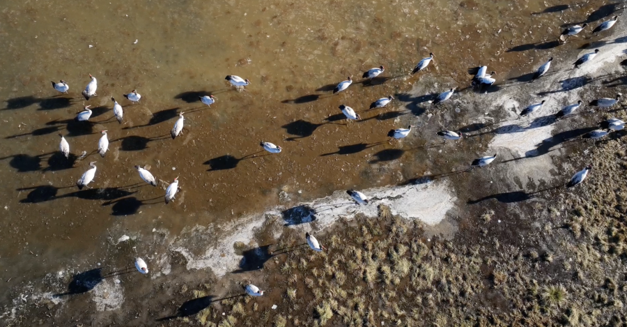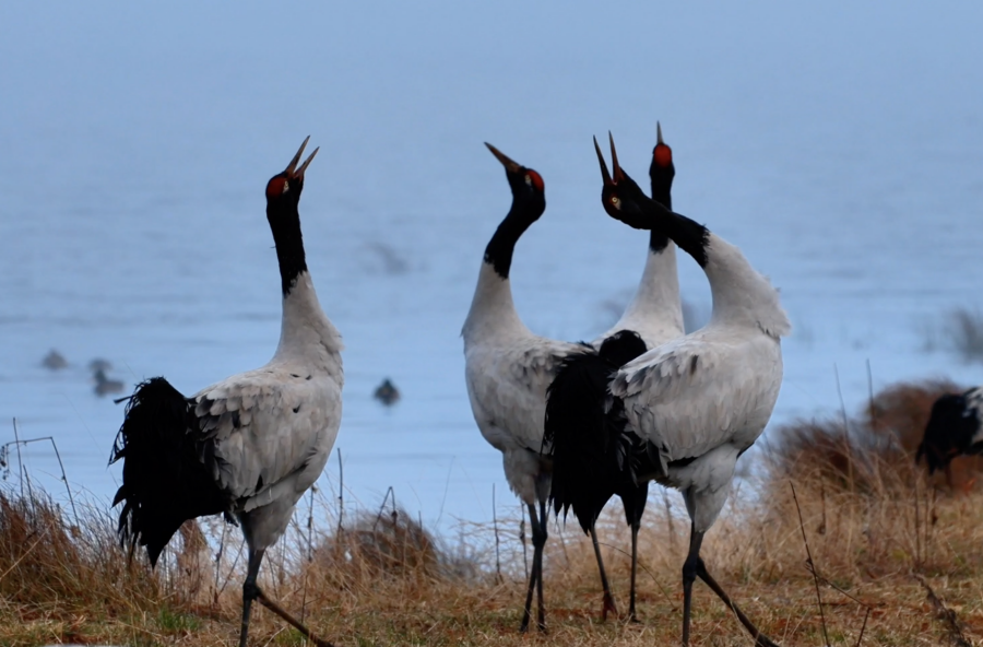 近日,攝影師在云南大山包黑頸鶴國家級(jí)自然保護(hù)區(qū)內(nèi),記錄到黑頸鶴在濕地附近活動(dòng)的場(chǎng)景。在群山環(huán)抱間,黑頸鶴漫步在澄澈的湖水邊,或自在飛翔,或悠閑踱步,或四處覓食,呈現(xiàn)出一派生機(jī)勃勃之景。